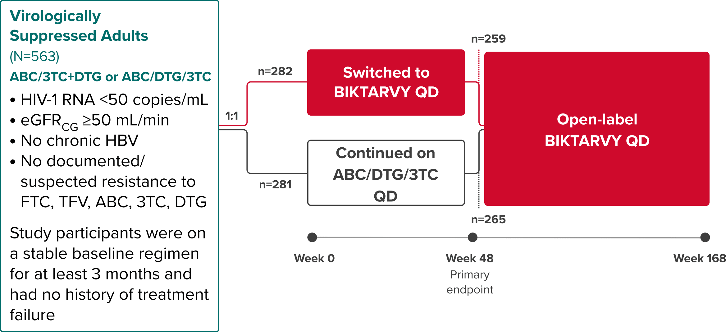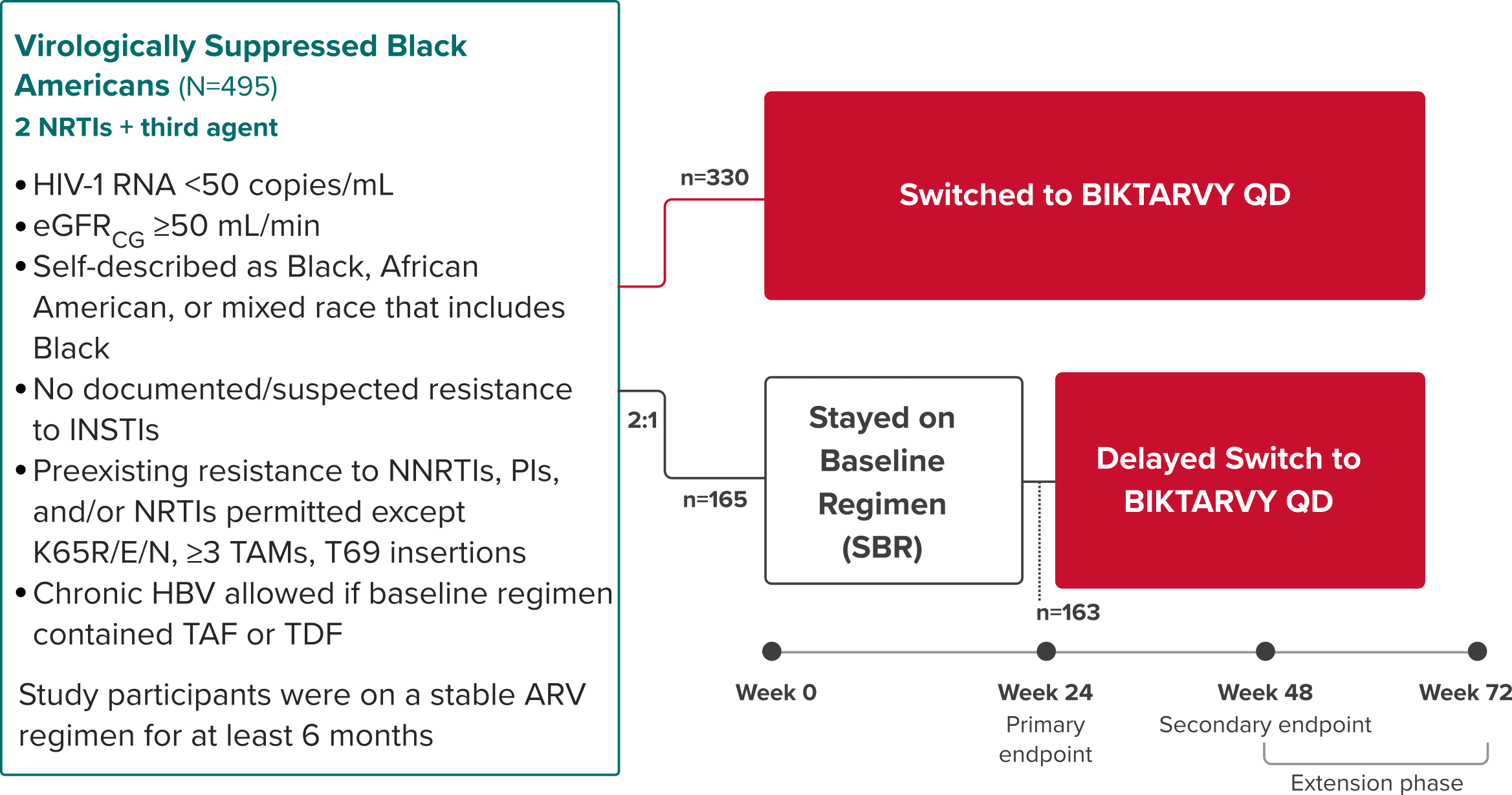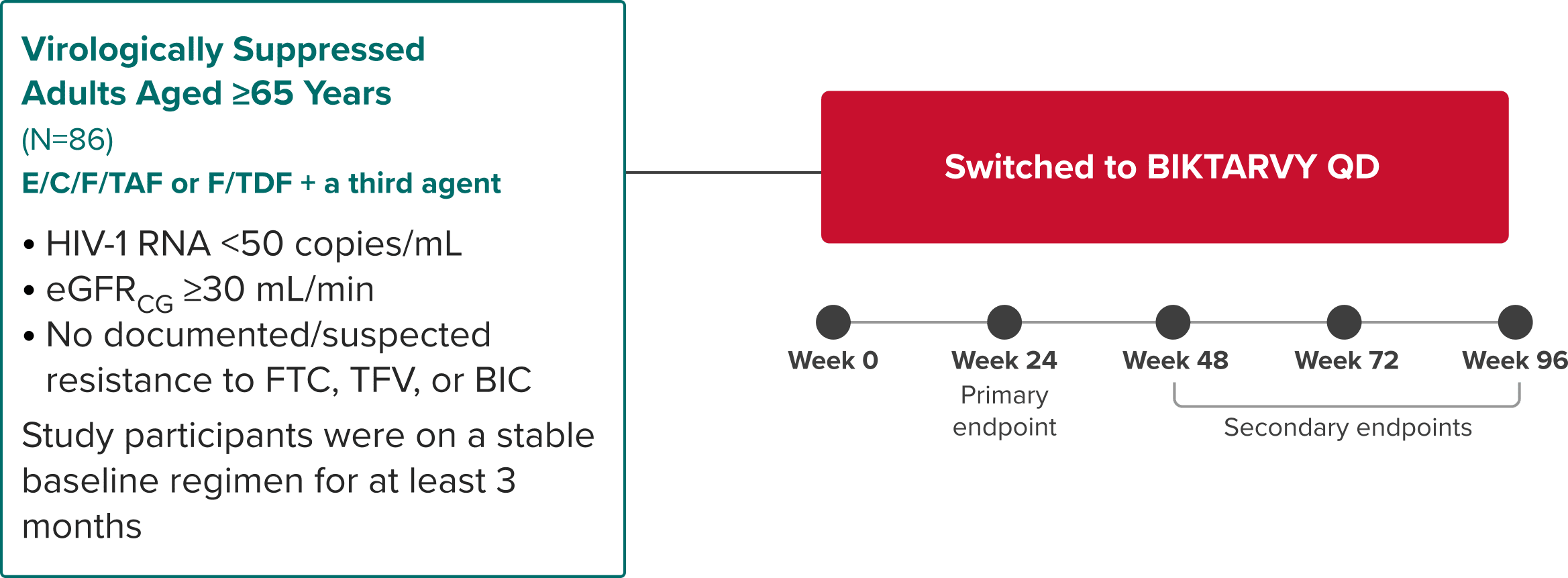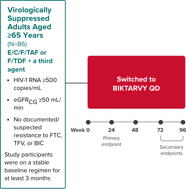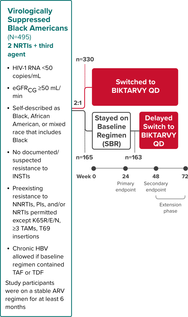 The analysis included study participants who were initially randomized to BIKTARVY and those who delayed switch to BIKTARVY after 24 or 48 weeks.
