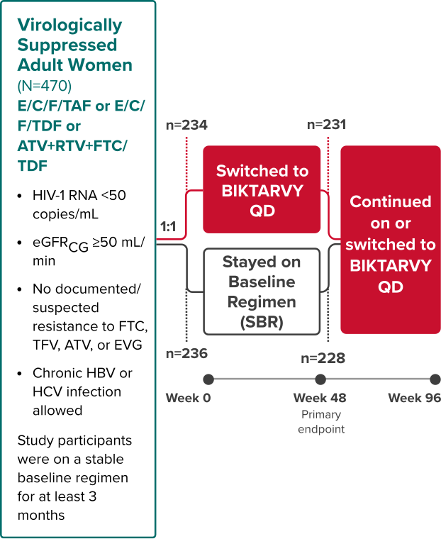- Safety and efficacy of switching to a FDC of B/F/TAF from E/C/F/TAF, E/C/F/TDF, or ATV+RTV+FTC/TDF in virologically suppressed HIV-1 infected women. ClinicalTrials.gov identifier: NCT02652624. Updated March 4, 2020. Accessed January 9, 2023. https://clinicaltrials.gov/ct2/show/NCT02652624